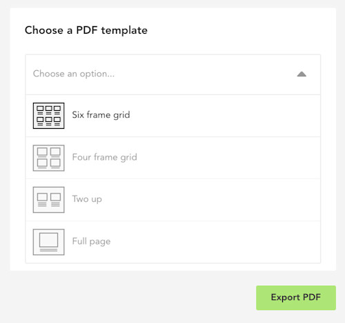 Your storyboards don’t exist in a vacuum. That’s why Boords supports an array of export options and storyboard templates to help you move effortlessly between the different stages of the creative process.