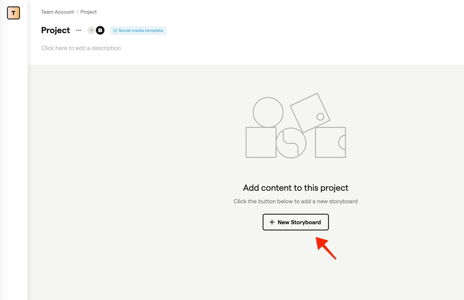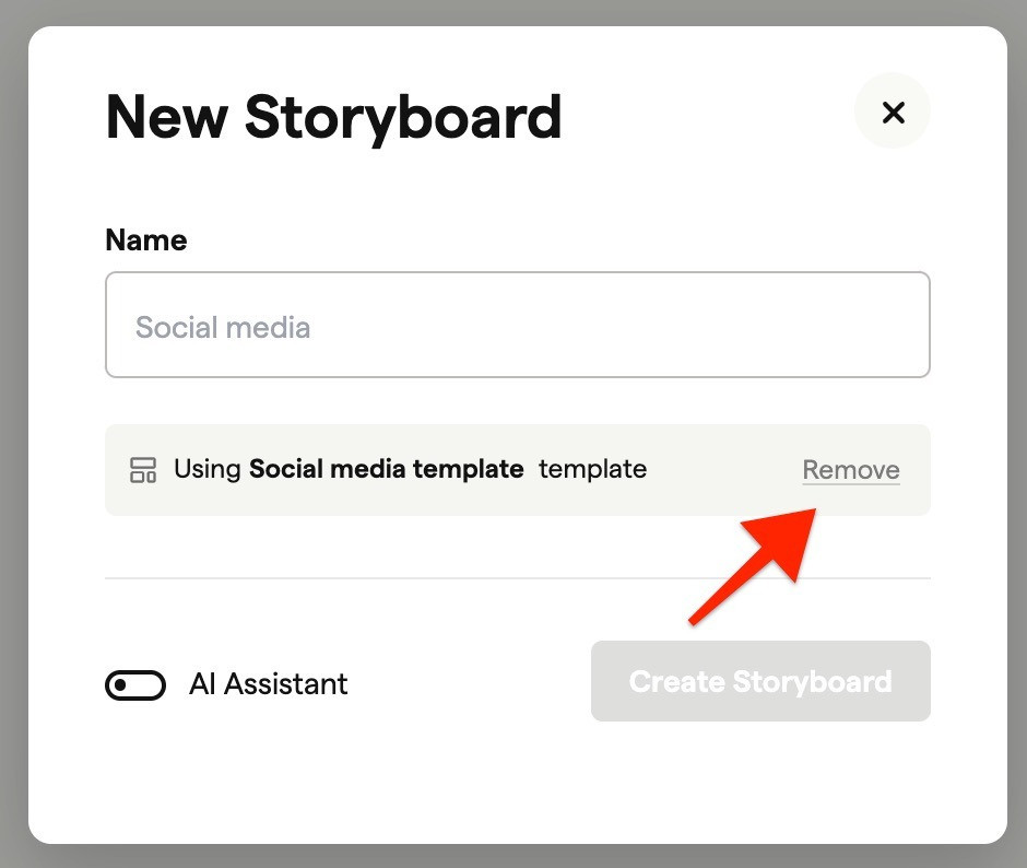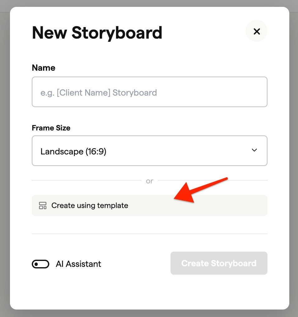 If the project has a template assigned (shown in blue at the top), that template applies automatically to new storyboards.