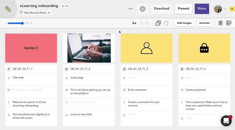 Storyboarding can seem like a lot of effort, and it's often tempting to start designing your online course straight away. However, this stage is crucial for your project management. Any time you invest now will pay off later because you'll gather tons of feedback before starting the development process. Plus, it's a breeze with a tool like Boords.